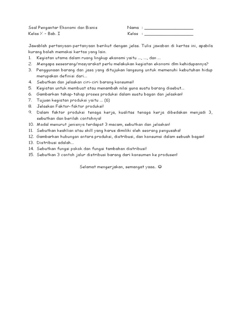 Berikut ini adalah contoh soal ulangan umum ekonomi kelas x sma semester i atau semester ganjil. Contoh soal ekonomi beserta jawaban untuk kelas 10 semester 2 tulisan ini, berisikan materi uji kompetensi tentang ekonomi mikro dan . Contoh soal geografi kelas x semester 2 beserta jawabannya (essay). Lengkap 45 contoh soal essay ekonomi kelas 10 sma ma dan. Kate bank berasal dari bahasa italia, yaitu banca yang artinya.